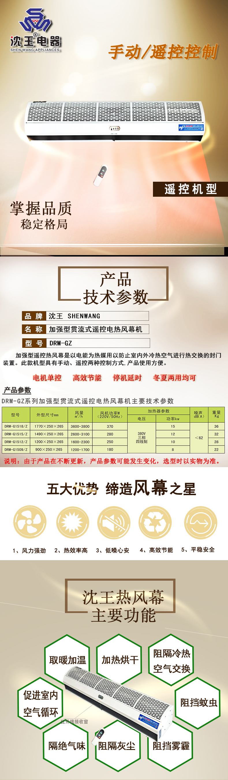 簡介:加强型遥控热风幕是以电能为媒用以防止室内外冷热空气进行热交换的封门装置。此款机型具有手动、遥控两种控制方式,产品使用方便,其主要功能有:电机单控、高效节能、停机延时、冬夏两用均可。