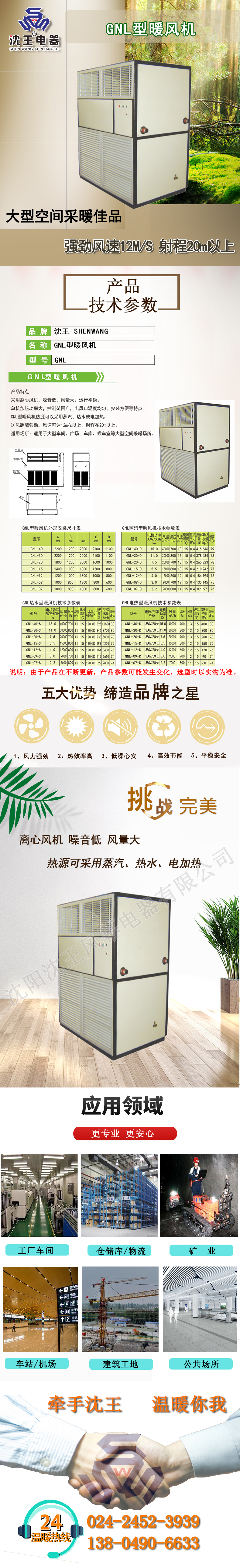 簡介:采用离心风机,噪音低,风量大、运行平稳。单机加热功率大,控制范围广,出风口温度均匀,安装方便等特点。GNL型暖风机热源可以采用蒸汽、热水或电加热。送风距离强劲,风速可达12m/s以上,射程在20m以上。